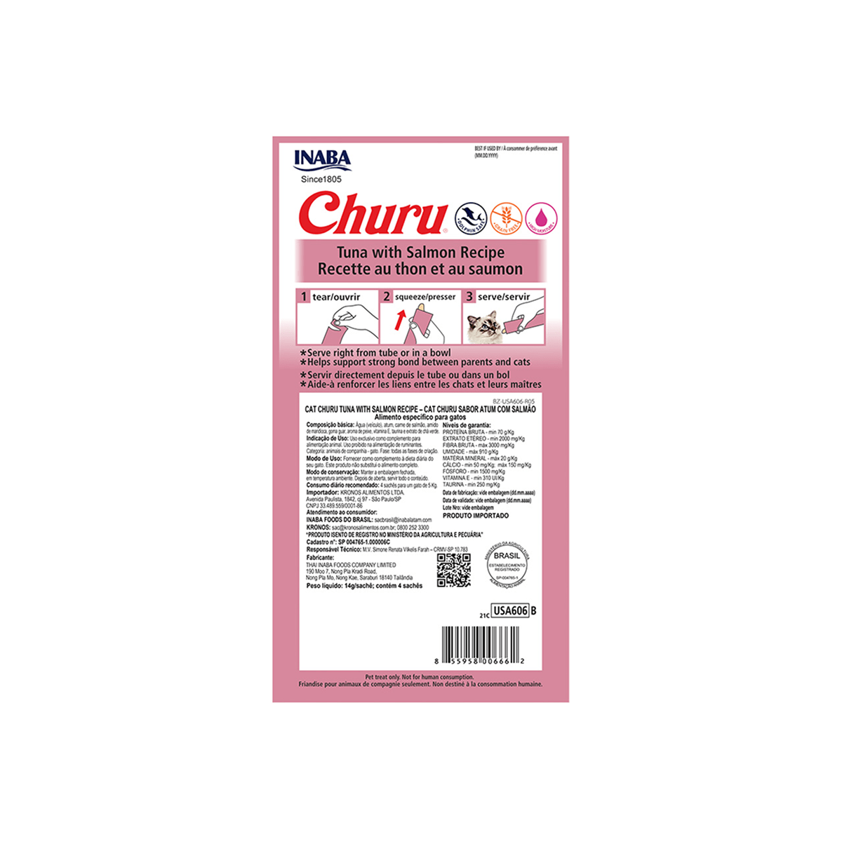 O Churu Gatos Atum com Salmão 56g é um petisco cremoso e extremamente palatável, ótimo para momentos de carinho, treino curto e até para ajudar em situações como corte de unhas ou escovação. A embalagem com 4 tubos de 14 g (total 56 g) permite oferecer na mão, no potinho ou misturar como topper na ração/sachê — ideal para estimular o apetite dos mais seletivos.